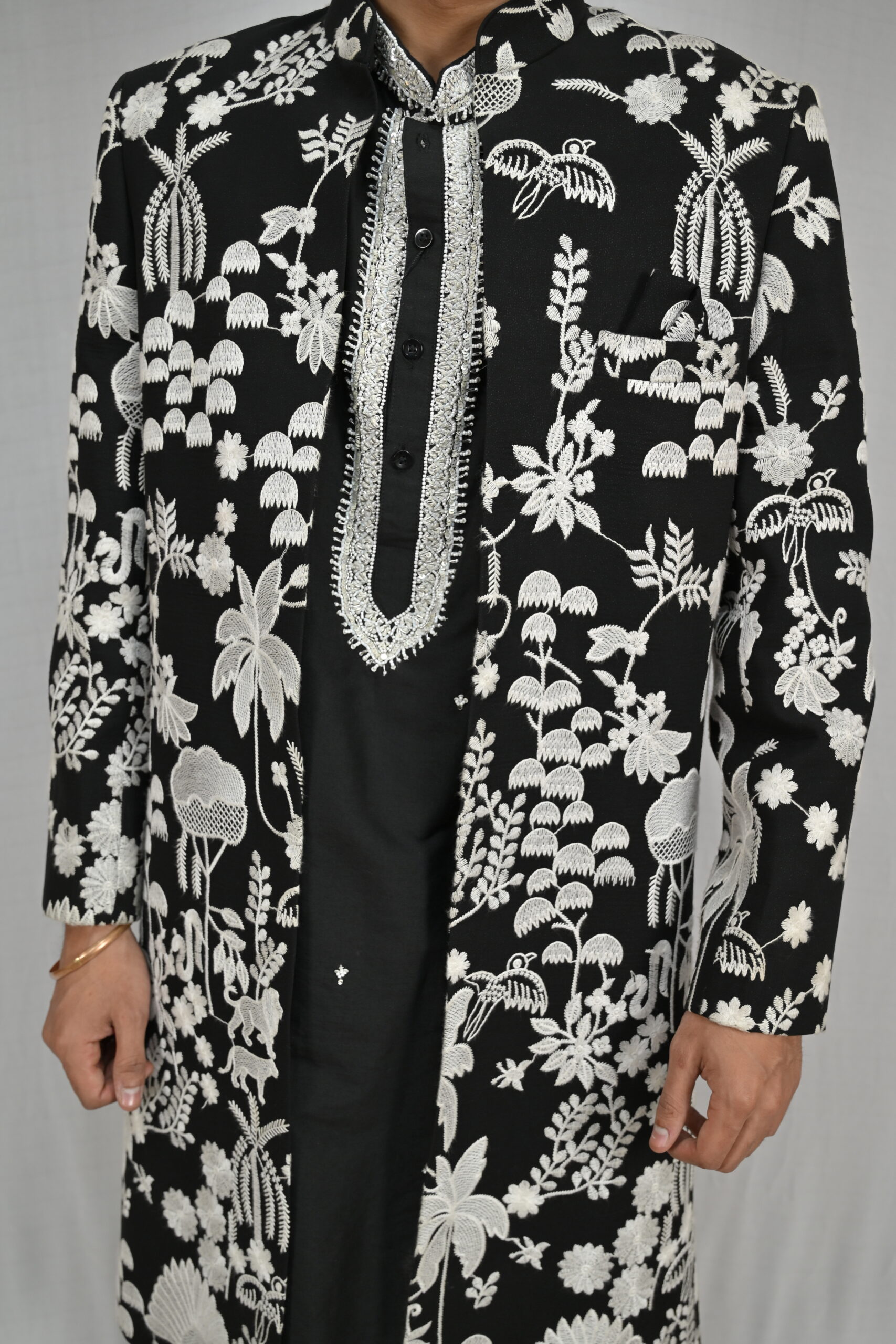 This look represents a modern take on traditional Indian menswear. This is black base fabric richly adorned with white floral and nature inspired embroidery ,creating a strong visual contrast. This intricate embroidery gives it a royal and elegant look ,suitable for weddings or festival occasion.
