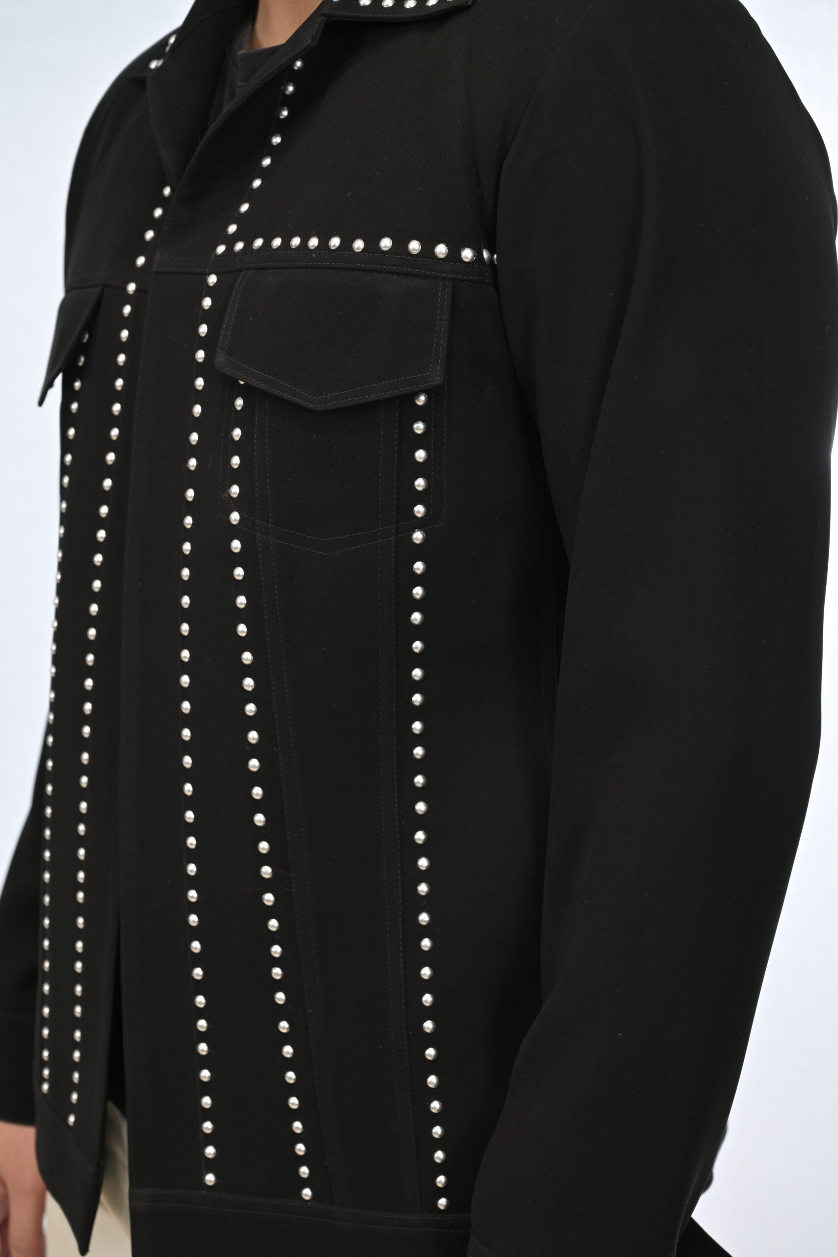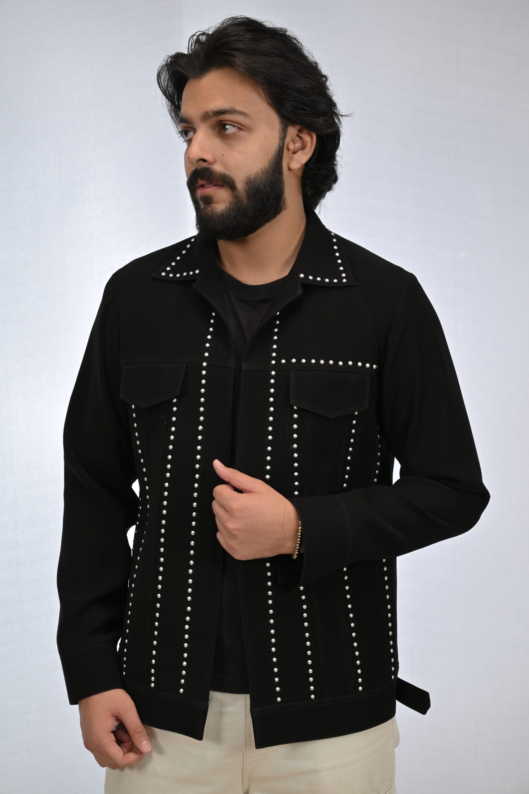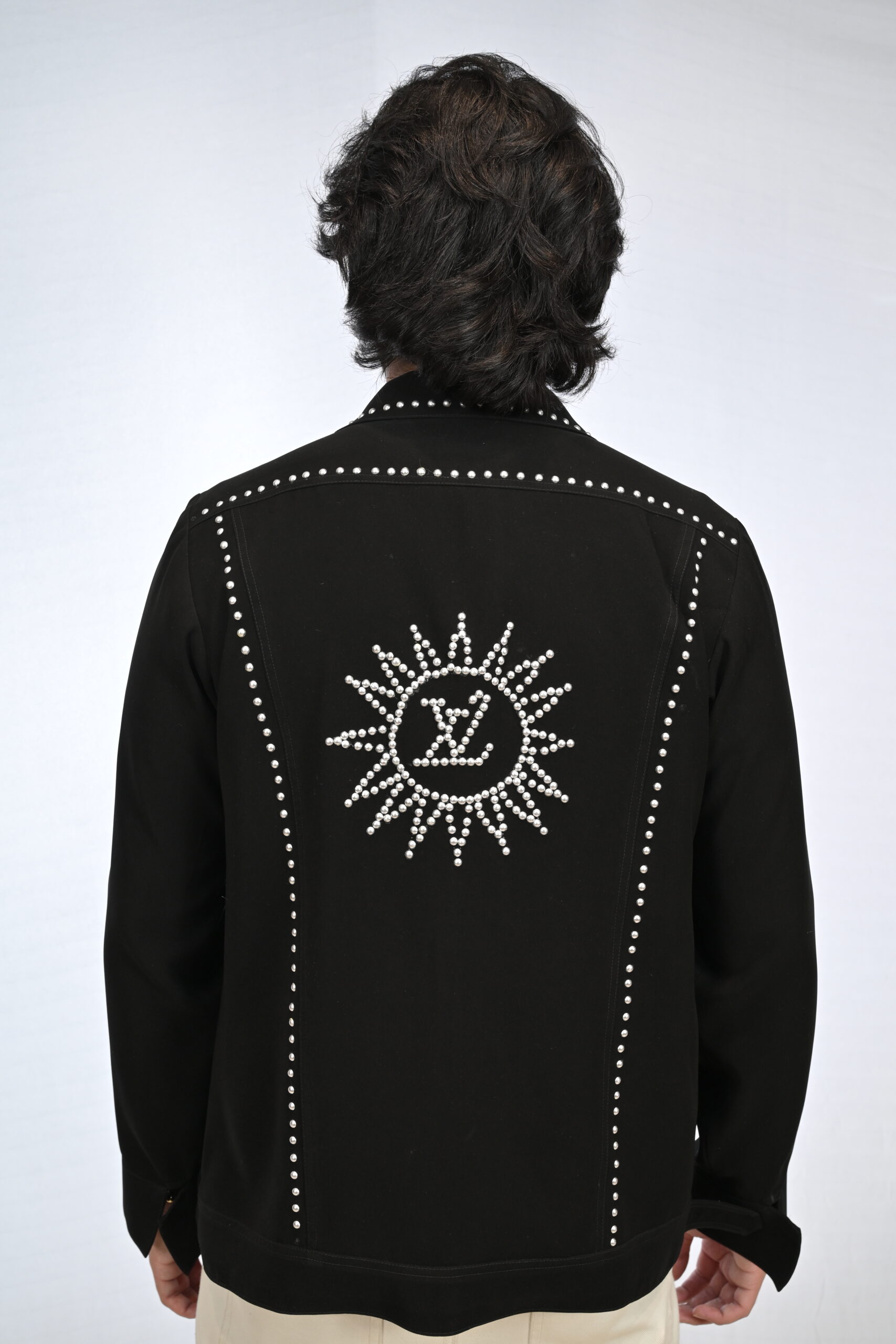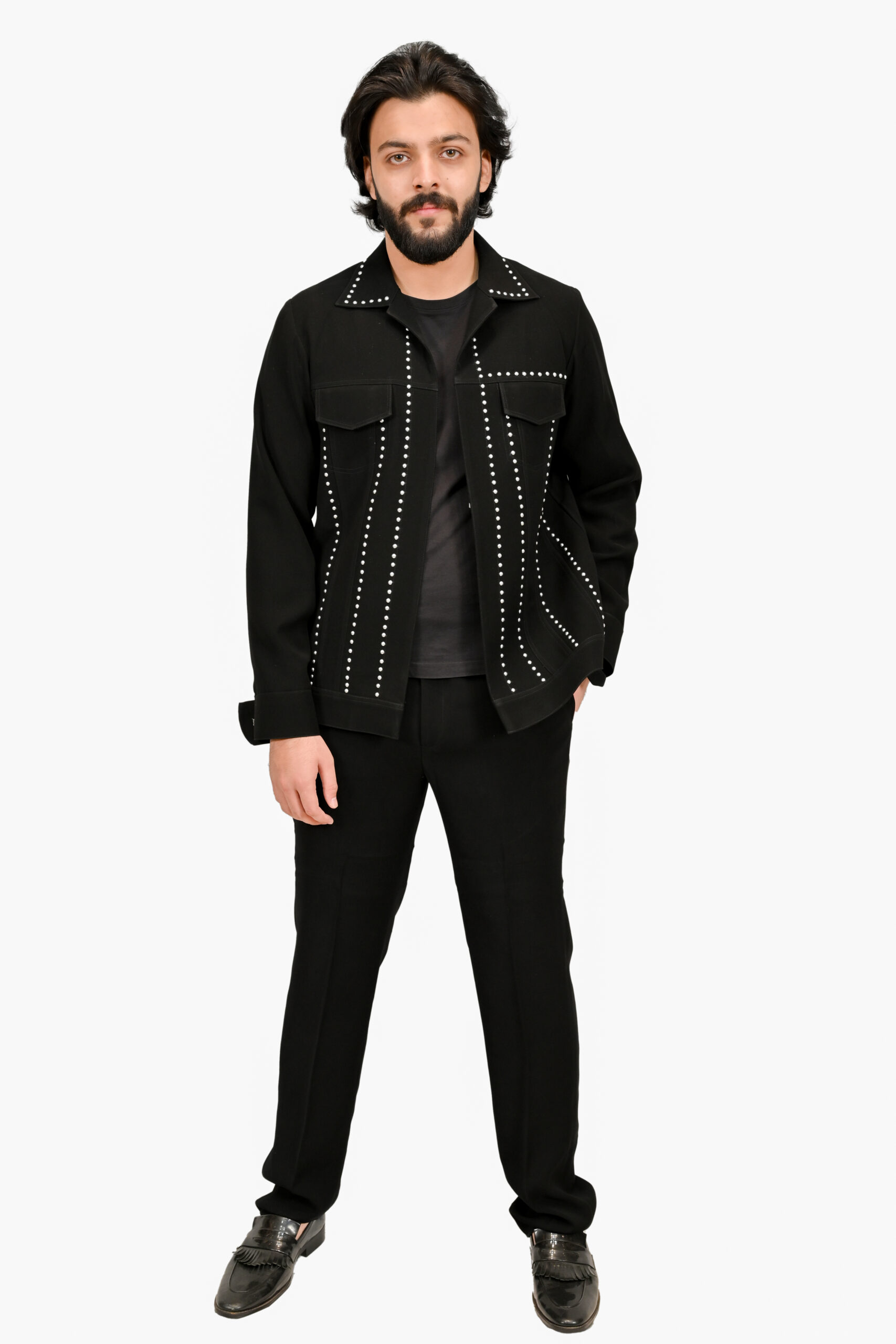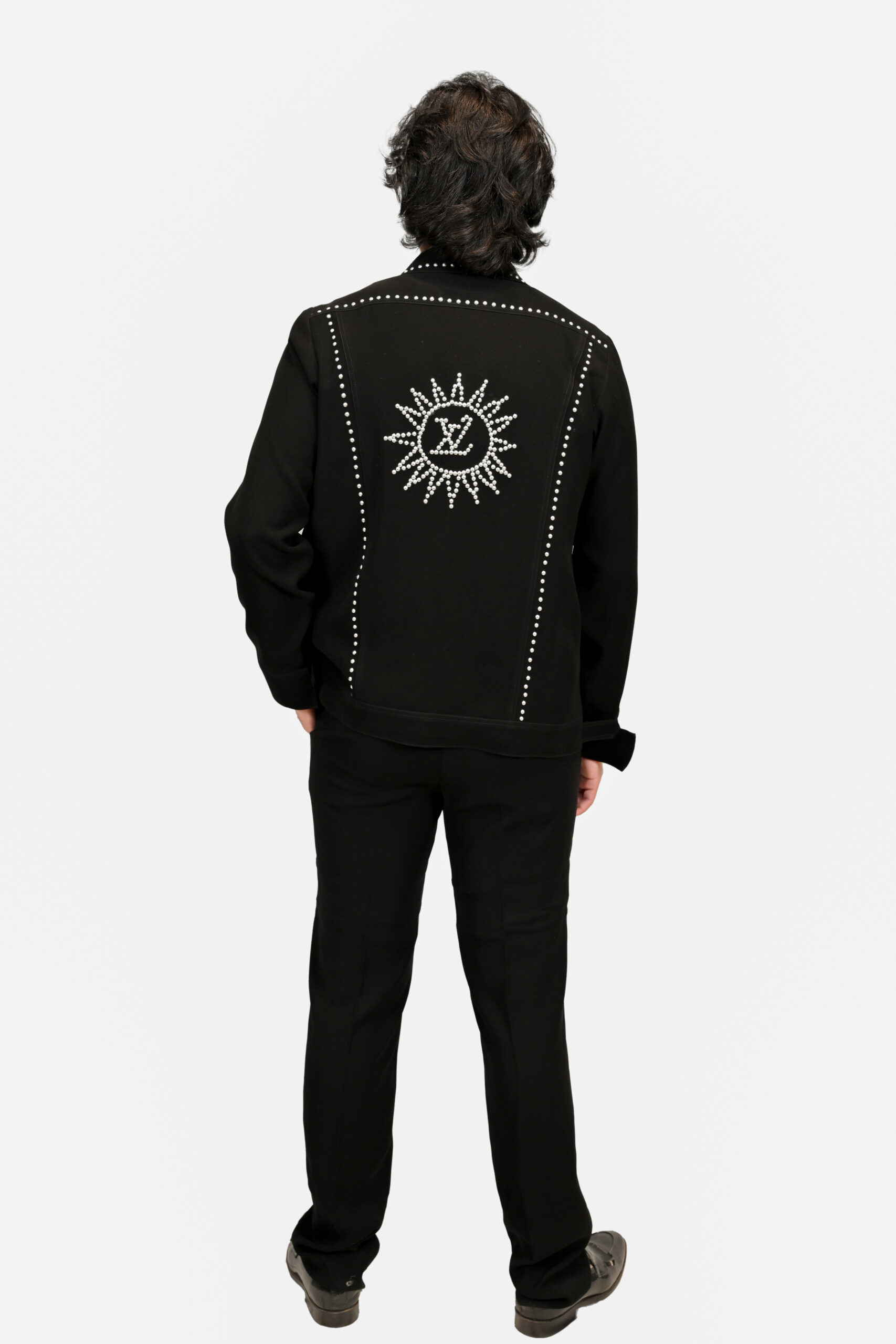 Elevate your style with our designer black full sleeve Co-ord Set for men, expertly crafted in polynosic fabric with intricate placement sequnce work and hand hemming details.