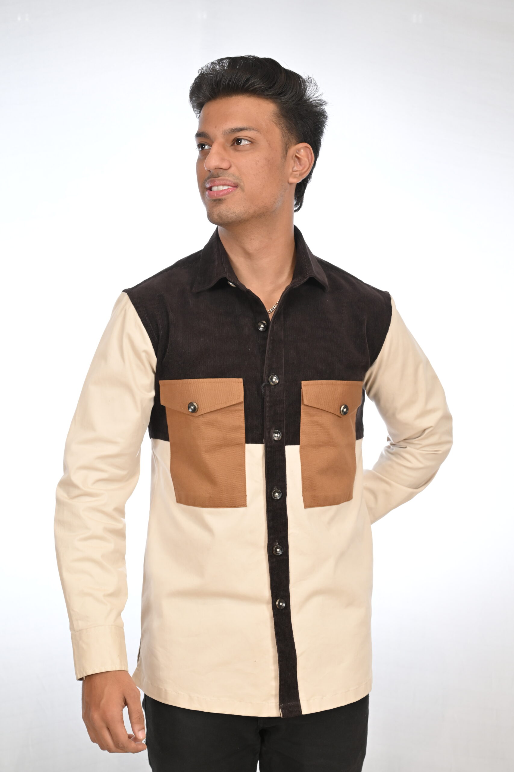 Shirt in soft cotton corduroy with a patch chest pockets. Turn-down collar, buttons down the front and pockets, dropped shoulders and long sleeves with buttoned cuffs.