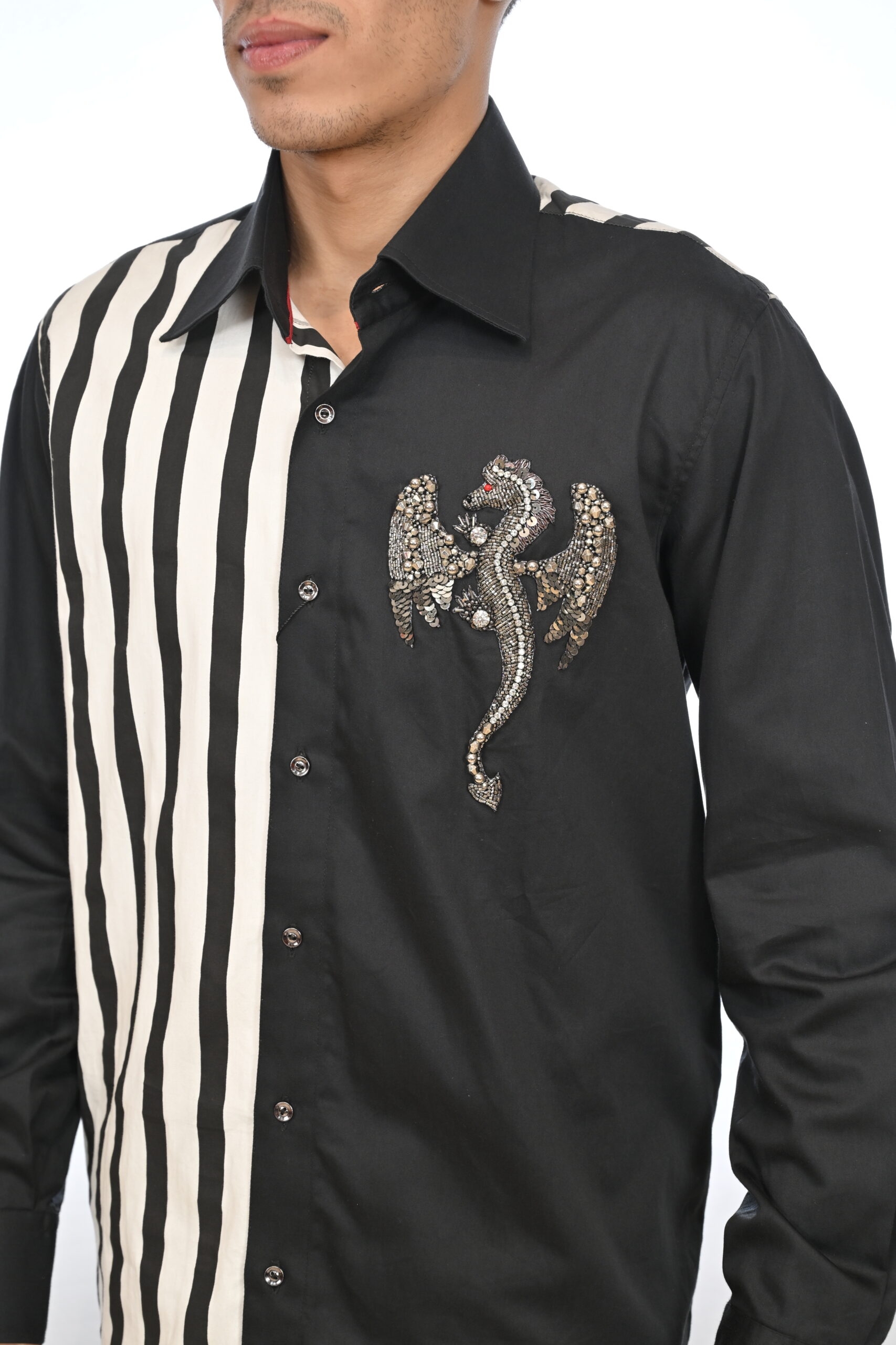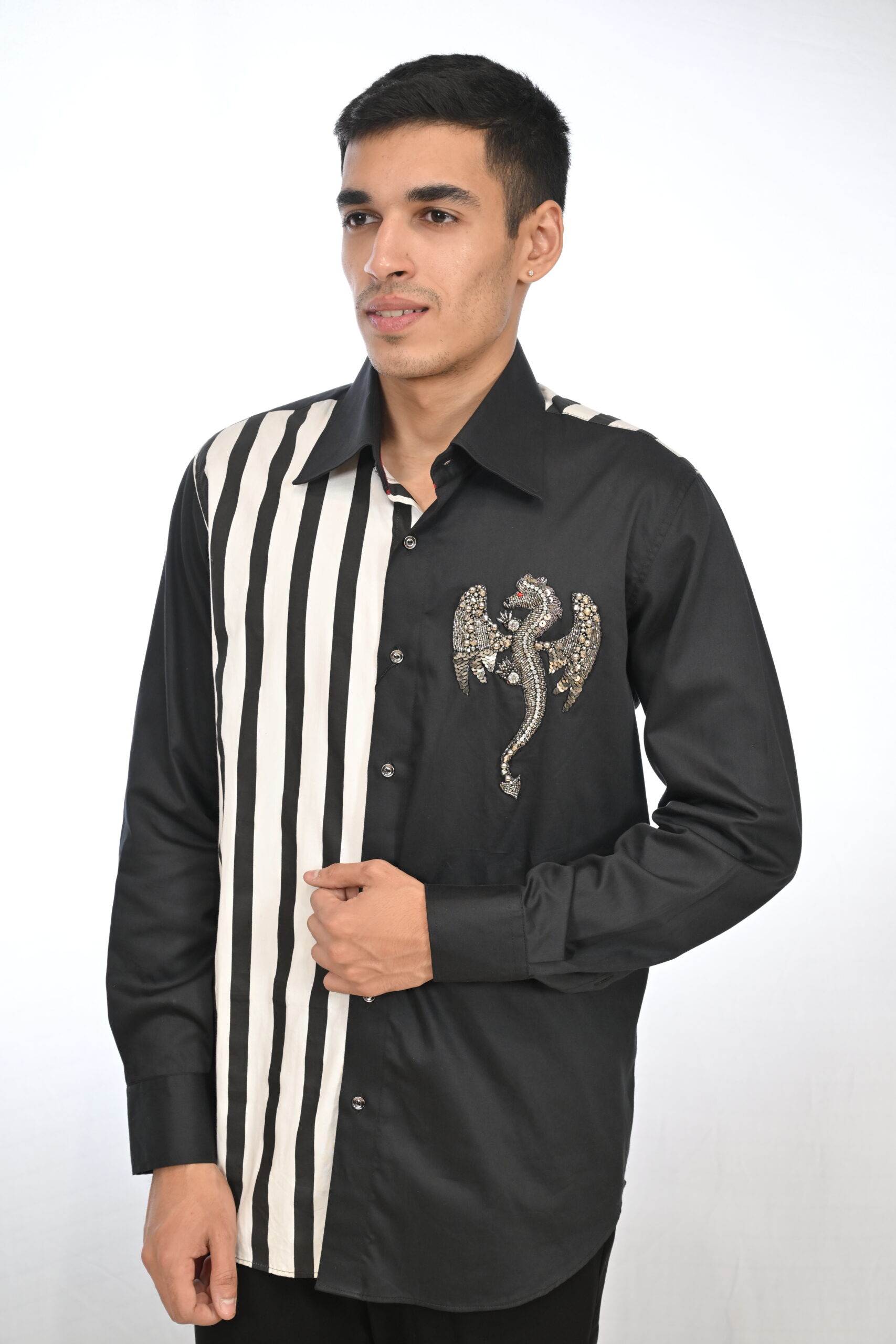 Go for this men’s Black shirt featuring metallic hand embroidery and partywear design,it has vertical black and white stripes on one side of the shirt addding a trendy contrast to the plain black section ,the most striking feature is the dragon embroidery on the chest material by silver, white crystal like beads or stones, giving it a luxurious statement making look.the dragon motif symbolizes power, strength, and bold style.