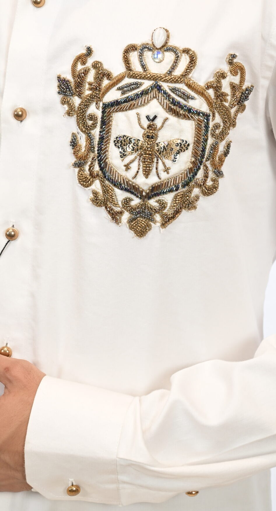 Go for this men’s white giza satin cotton premium designer shirt that takes you from boardroom to ballroom without any hassle,This shirt is defined by its luxurious, handcrafted embellishment—a motif created with intricate beadwork and sequins in metallic tones,and golden buttons. It is a full-sleeved shirt with a normal collar, buttoned cuffs, and a curved hemline,,giving it a fresh and artistic appearance.