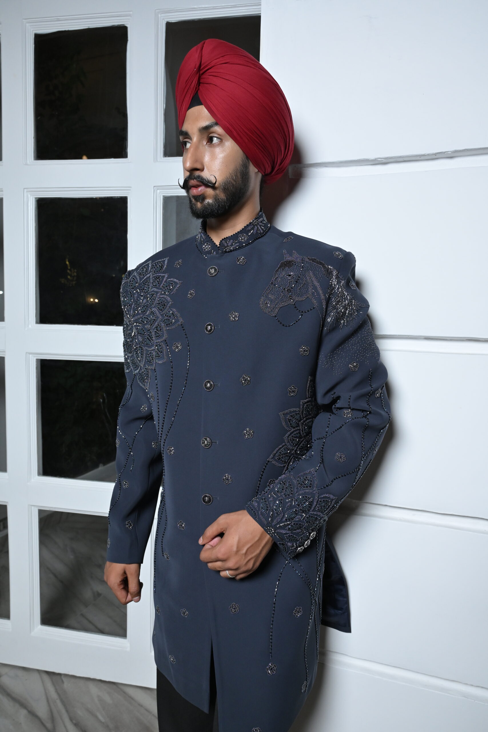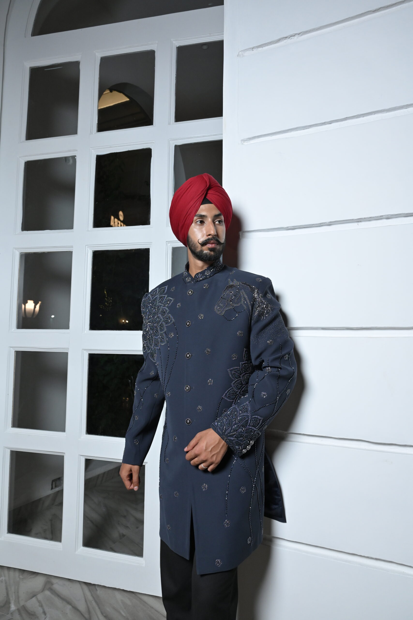 This look represents a modern take on traditional Indian menswear.This is a deep navy color to bring a royal and classy feel,combined with detailed embroidery work on the shoulder and sleeves, adding a royal and artistic touch.it has a structured silhouette with metallic buttons and one side to give it a designer touch.This outfit is perfect for weddings or formal occasion,blending culture with contemporary style.”