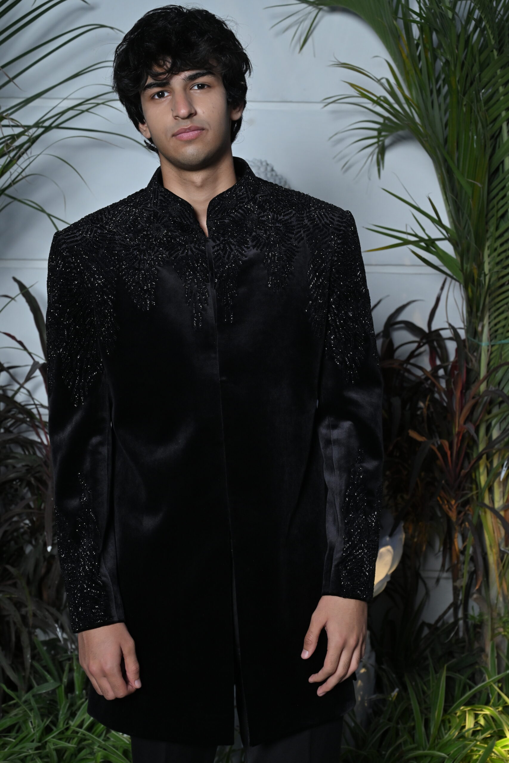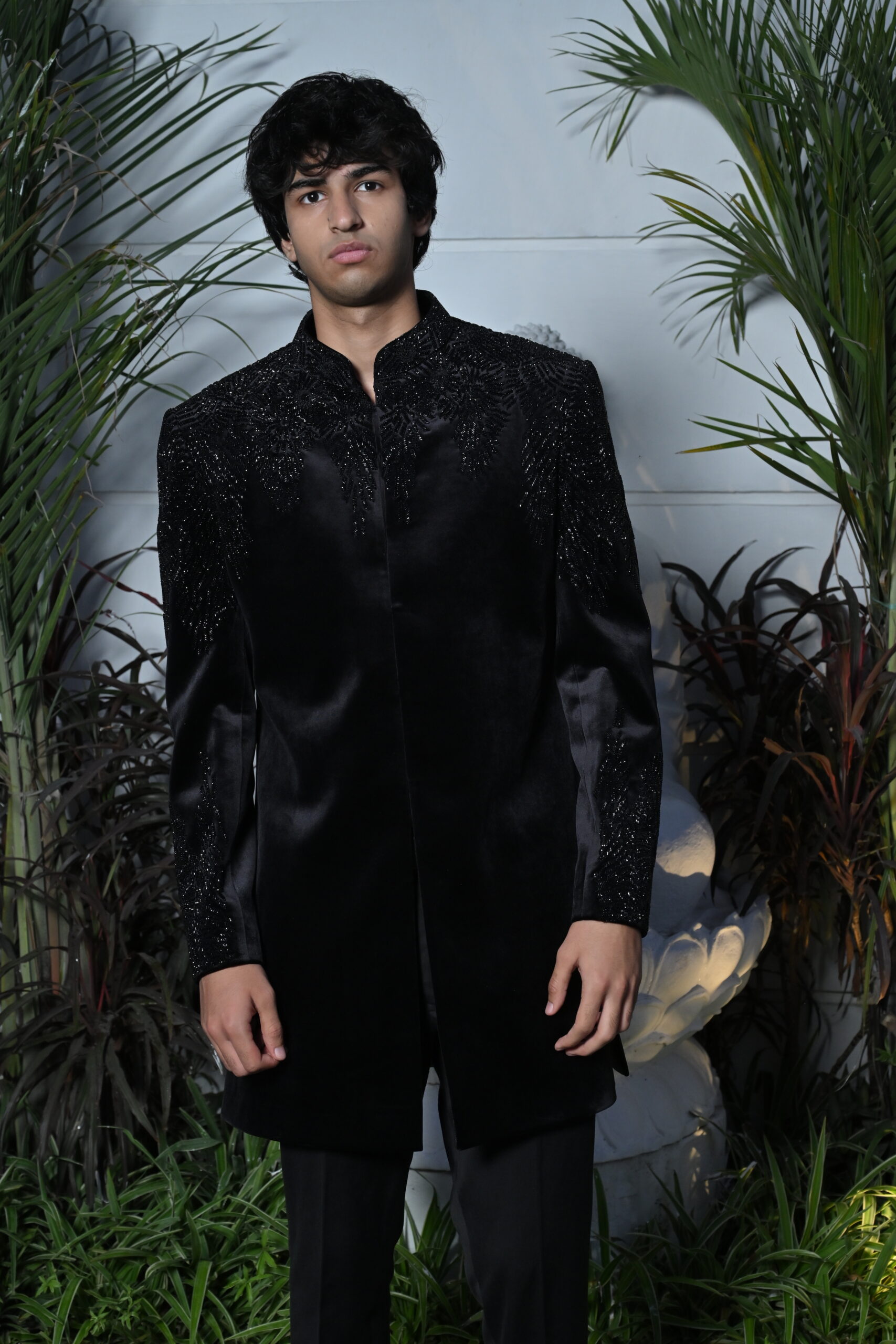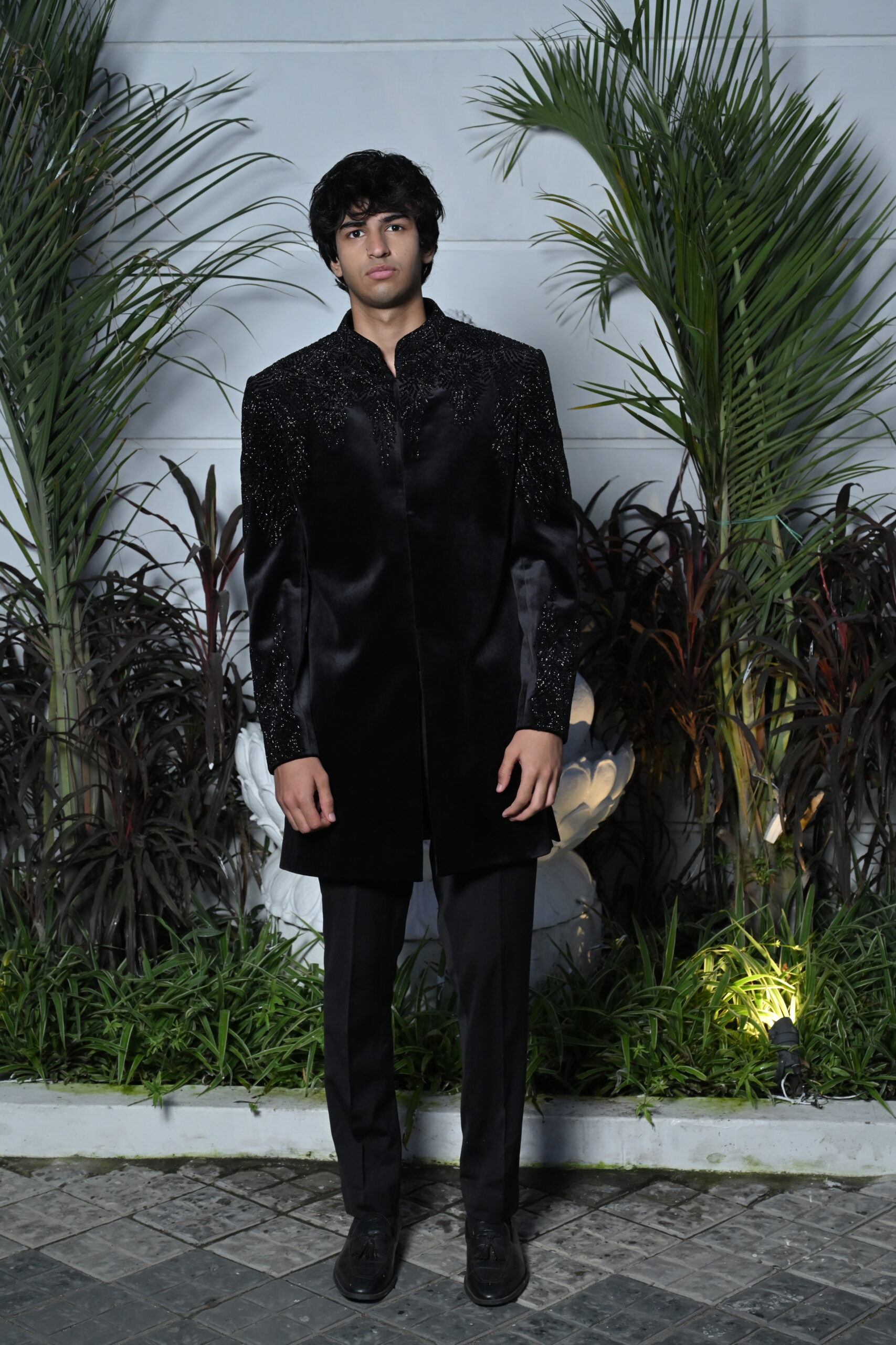 This look represents a modern take on traditional Indian menswear.This is a black color to bring a royal and classy feel,combined with detailed embroidery work on the both shoulder,neck and sleeves, the rich velvet fabric enhances its opulence, while the meticulously crafted details add a touch of uniqueness and refinement to your look .This outfit is perfect for weddings or formal occasion,blending culture with contemporary style.”