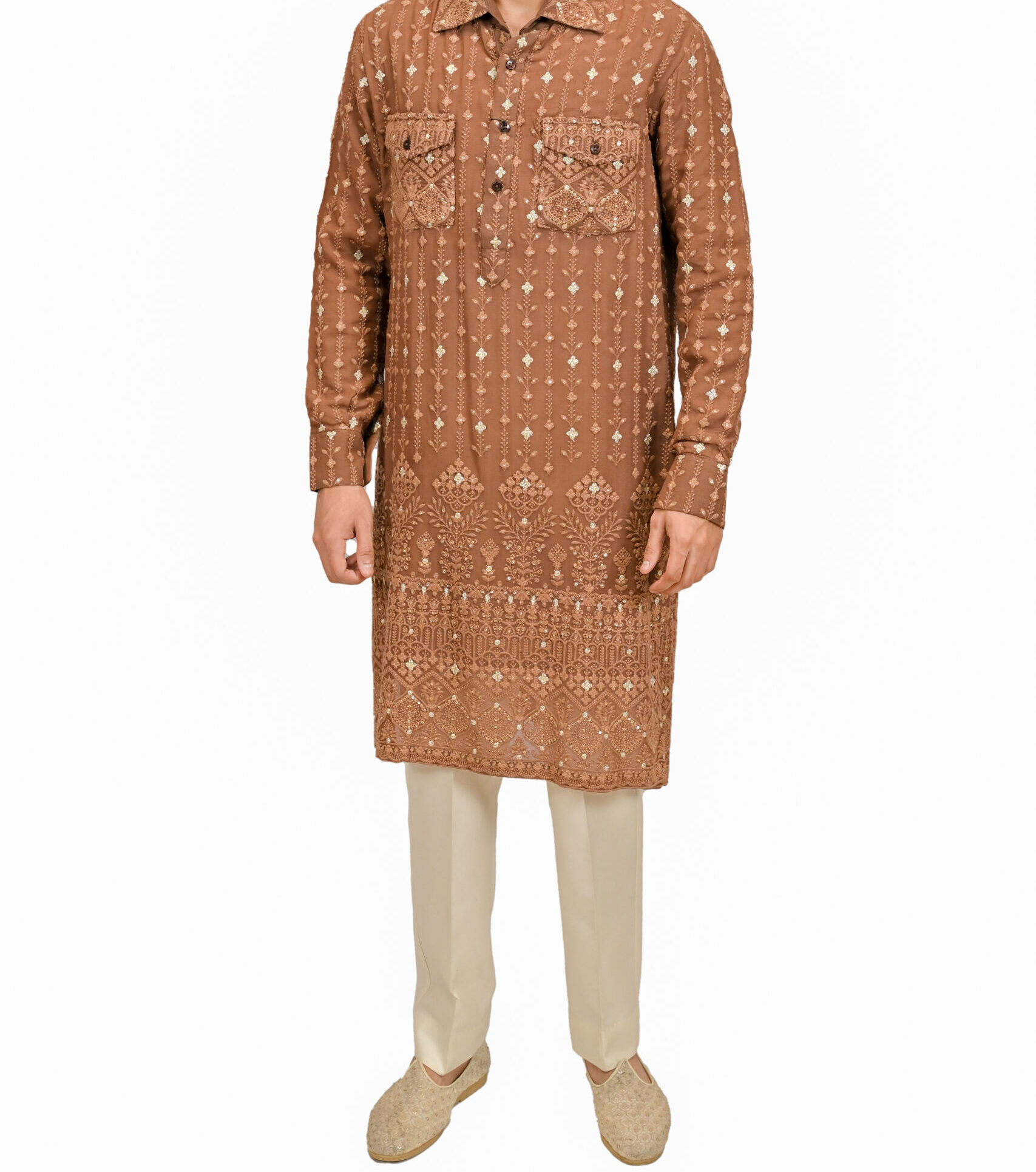 Festive extravagant brown all over sequinced kurta on georgette fabric that has a viscose lining. Has full sleeves, knee length and side slits.