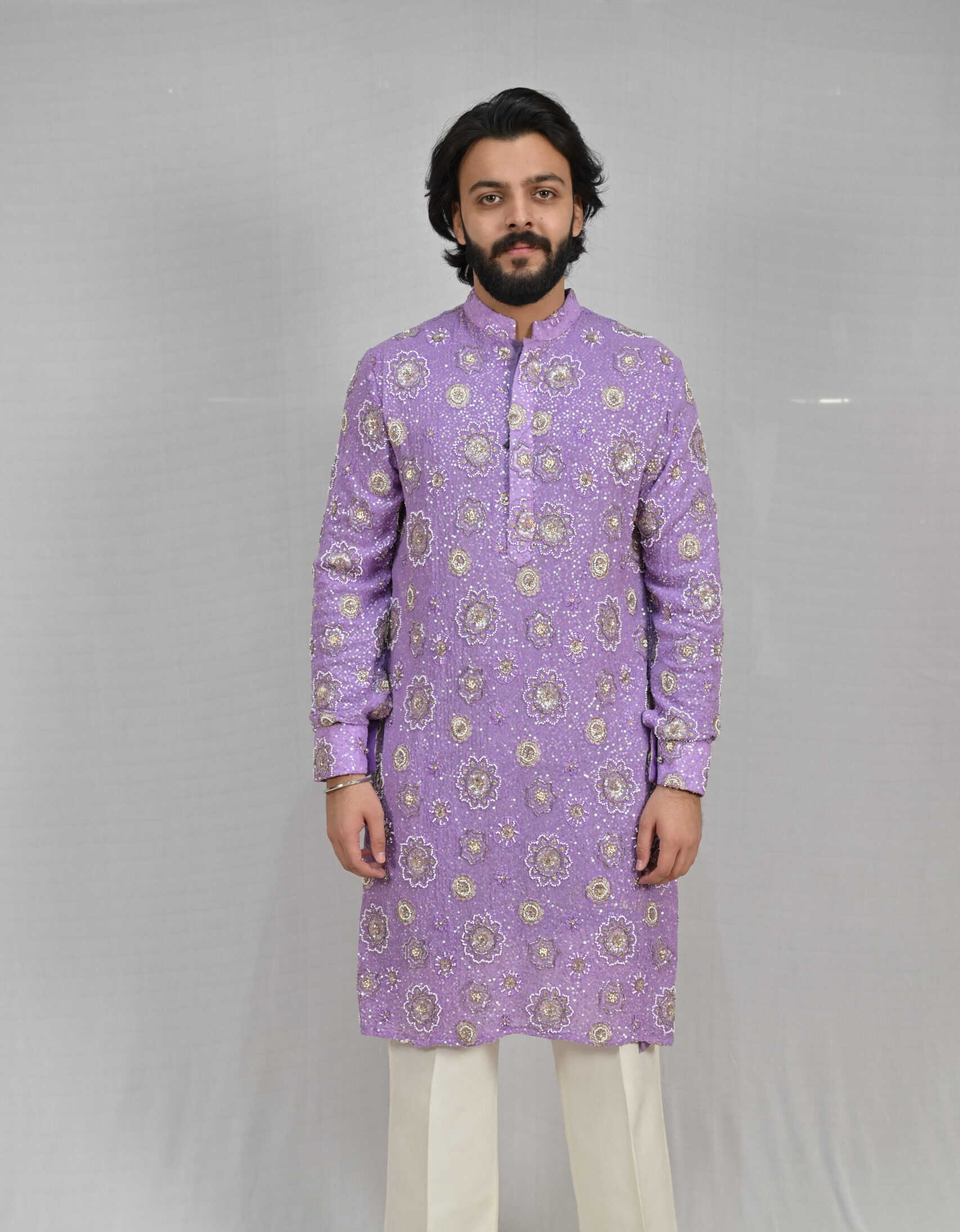 Festive extravagant lavender all over sequinced kurta on georgette fabric that has a viscose lining. Has full sleeves, mandarin collar, knee length and side slits.