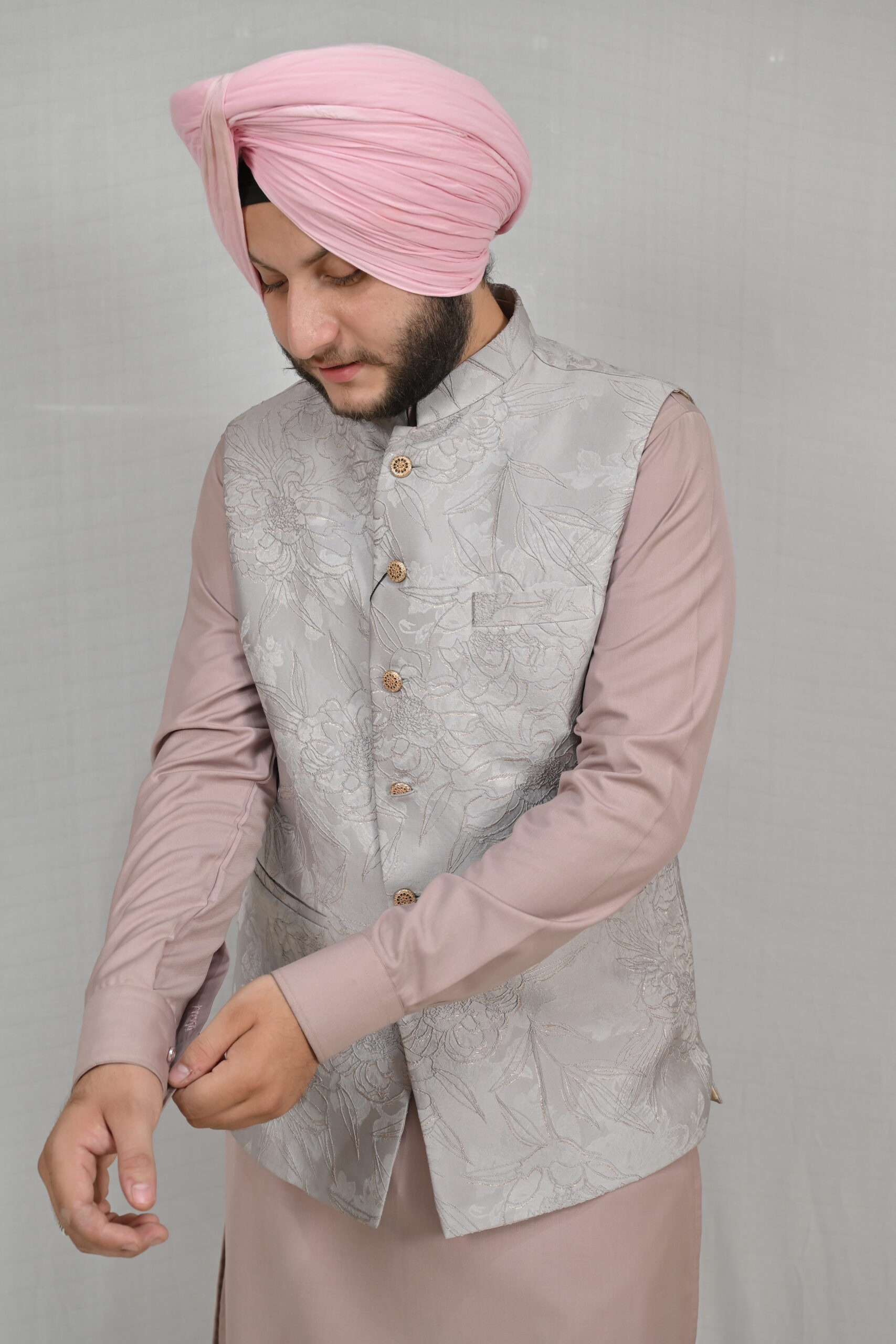 This powder pink kurta jacket set is a celebration of light self print fabric jacket, making it a festive favorite. Ideal for pre-wedding, jago functions with flair. we’re delivering styles you love, just as promised.